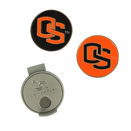 Large golf ball marker with the Oregon State Beavers logo that is magnetically held to the metal clip which fits over the brim of your hat.