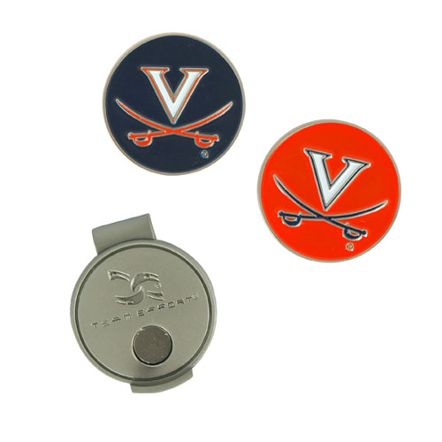 Large golf ball marker with the Virginia Cavaliers logo that is magnetically held to the metal clip which fits over the brim of your hat.